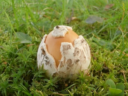 Makstij, no kuras izspraucas oranžās makstsēnes cepurīte un kātiņš,