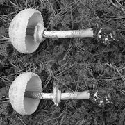 (ne tā kā mušmirēm, kurām kātiņš ir bez zvīņām).